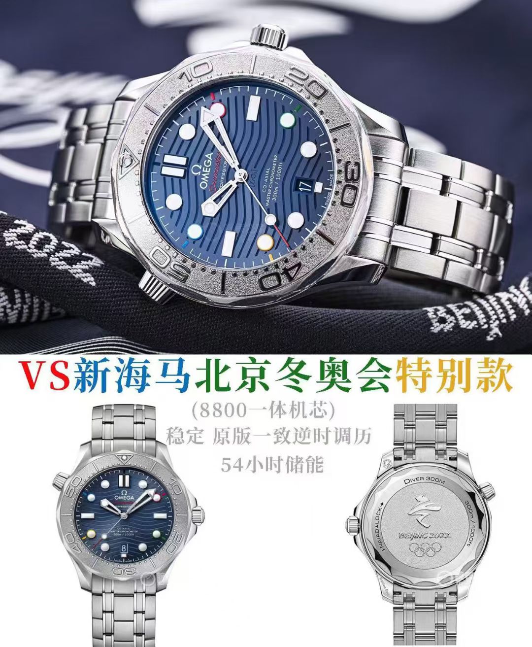 VS 新海马300米北京奥运会特别版 42 毫米直径 陶瓷盘 并以激光雕刻波浪纹,表盘刻度以奥运五环标志性颜色,表背有会徽且特有的NAIADLOCK 技术(正底盖)。搭VS最新8800一体机心稳定可靠,且佩戴上手非常有质感!
